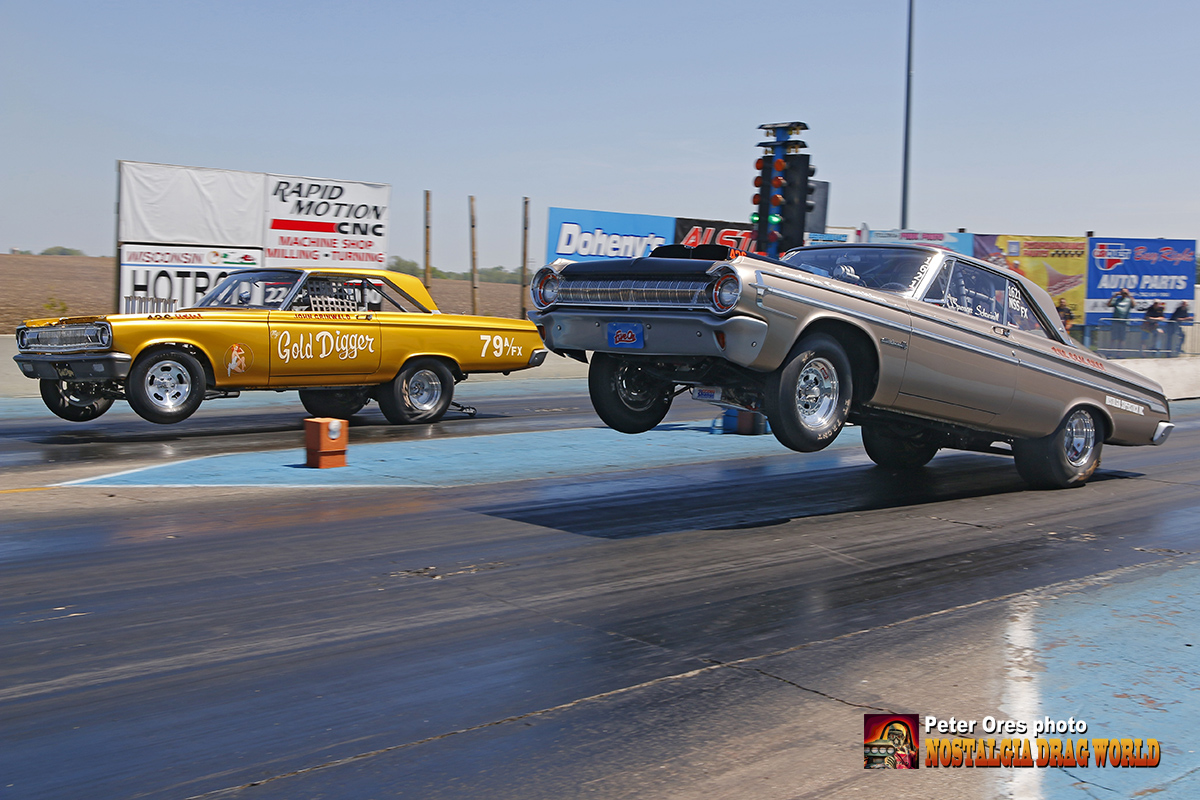 The feature pairing was between John Grinwald’s ’65 Dodge Coronet ‘My Gold Digger’ altered wheelbase car and Spencer Schreindl’s ‘ ‘Max Wedgie ’64 Dodge Polara, which was engineered into a 0.2 elapsed time improvement over the off-season.