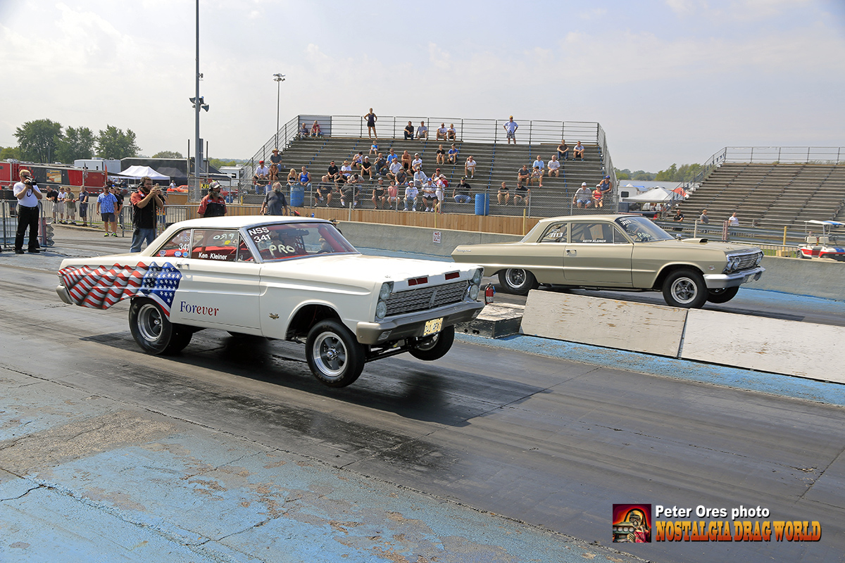 Ken Kleiner (near lane) in his Mercury Comet altered wheelbase “Forever” doing battle with his son Keith in his 1963 Chevrolet “409